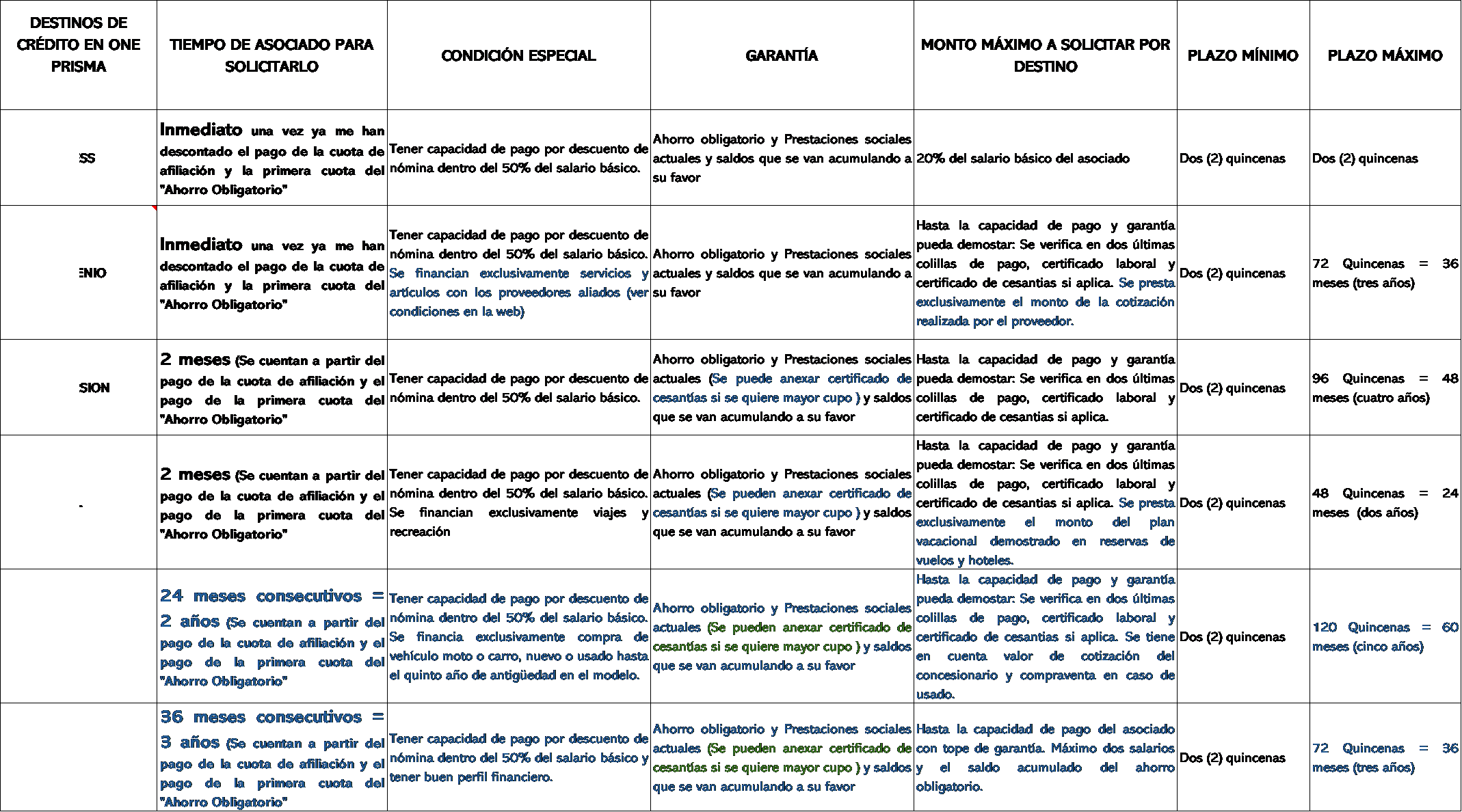 Es el destino de crédito por medio del cual se financian los servicios y artículos que se adquieren a través de los proveedores con quien el Fondo One Prisma tiene convenios. En la sesión https://www.oneprisma.com/aliados encuentras nuestros aliados y en cada uno de ellos el proceso para solicitar la cotización y gestionar la financiación.
